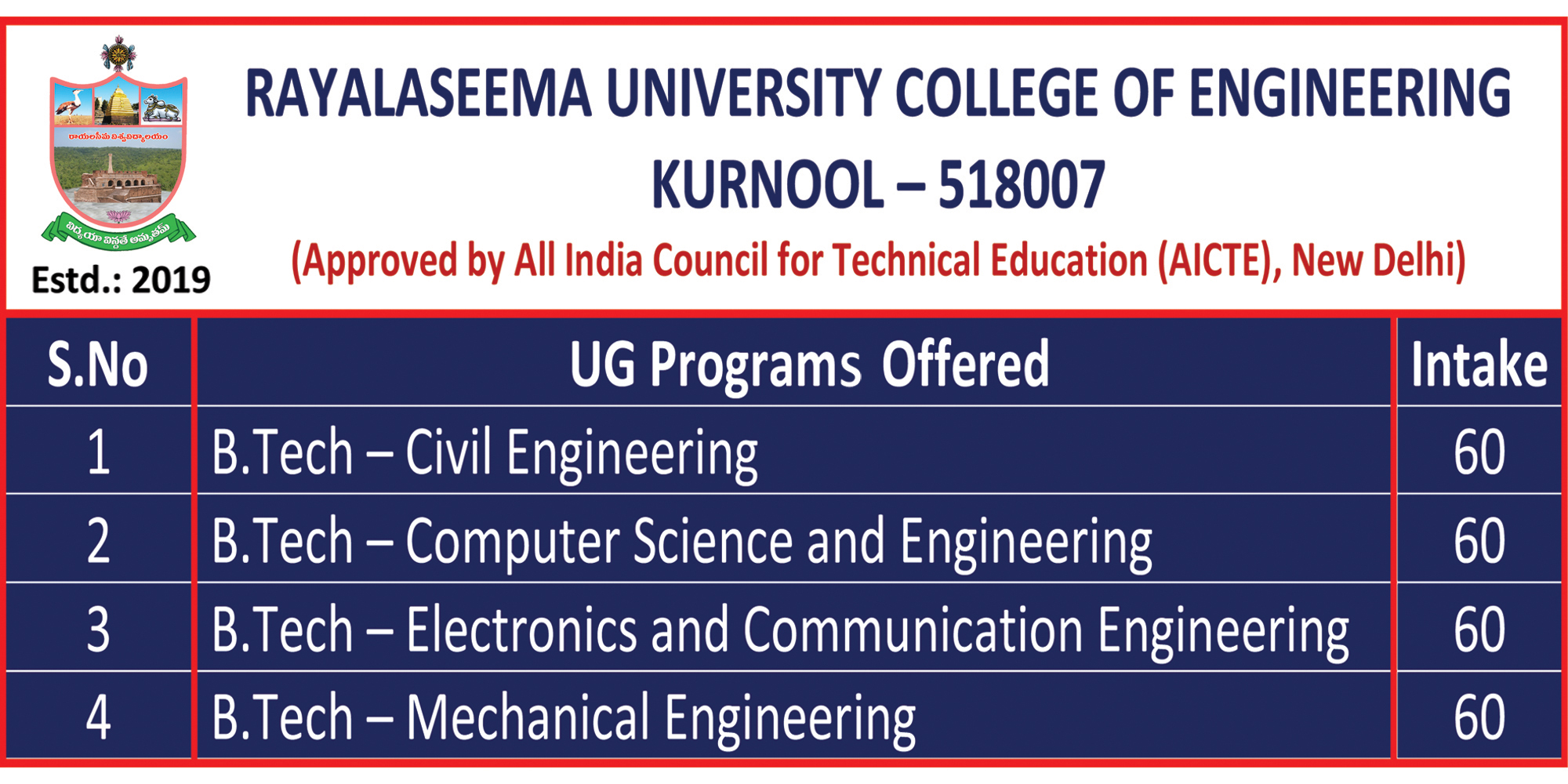 B.Tech (CSE) - Computer Science & Engineering with a sanctioned intake of 60 from the acaemic year 2019-20